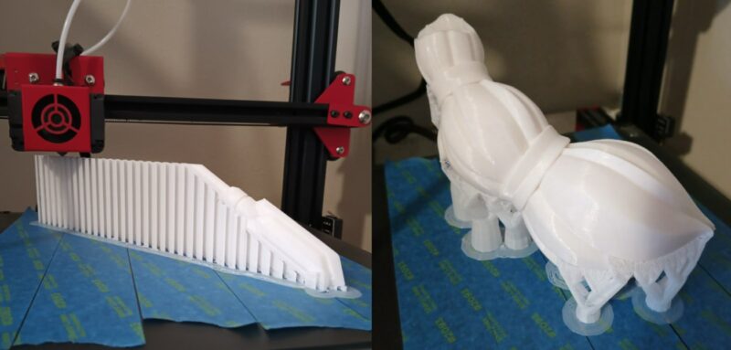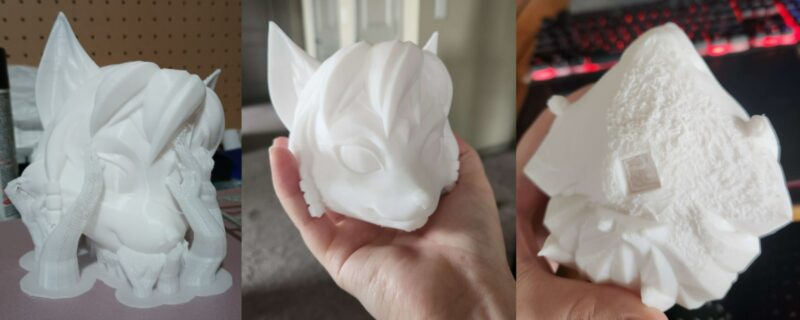 With testing complete, it was time to start printing the big stuff, starting with Krystal's head, probably the most complex and difficult part. After one failure, this piece would take 29 hours and 6 minutes to print. He would suffer at least another 5 failures on other parts during the printing process. In the right-most photo, you can see that although he used supports, there is only so much that they can do. There was a lot of cleanup on the underside of Krystal's muzzle to smooth it out.