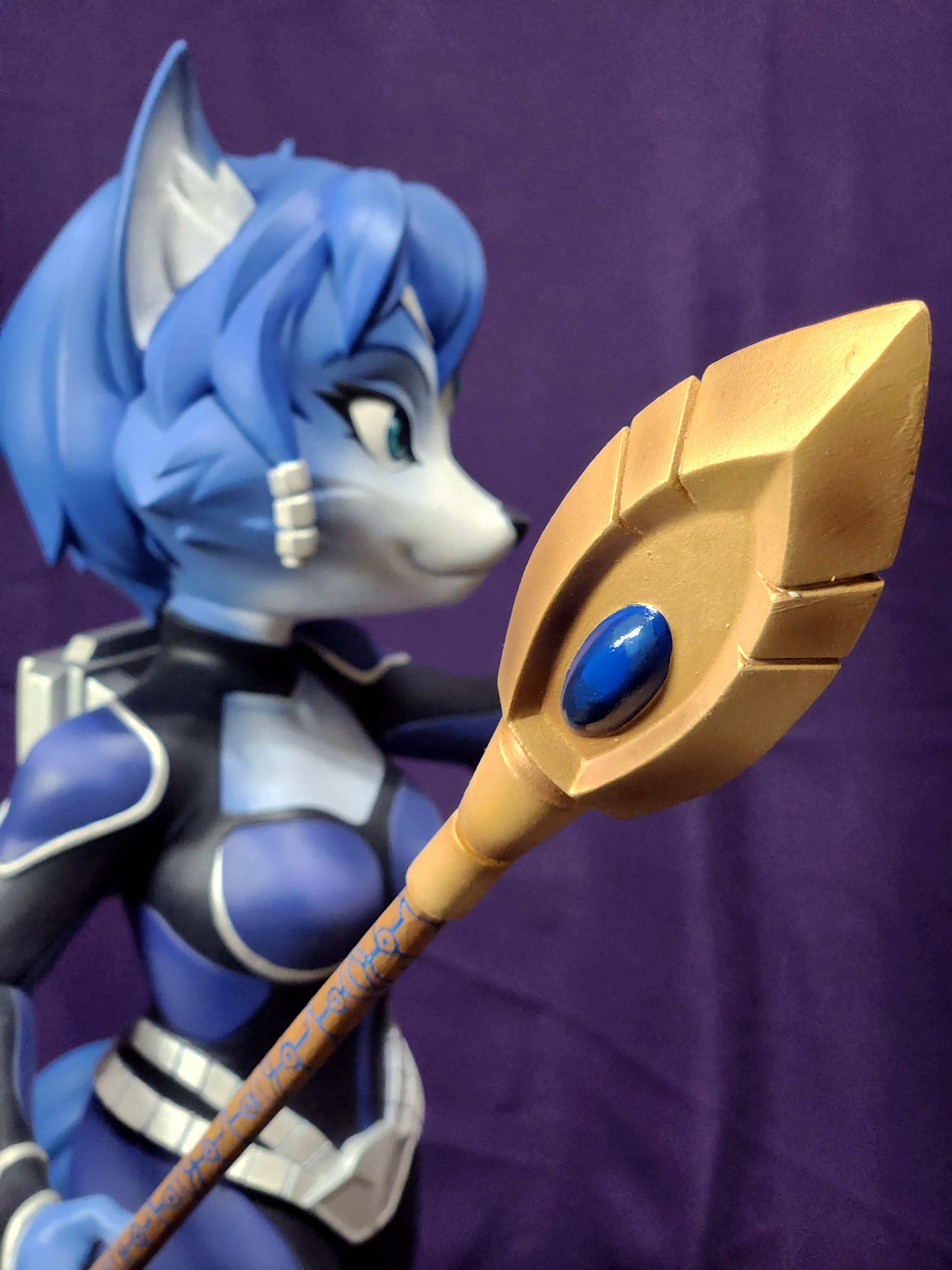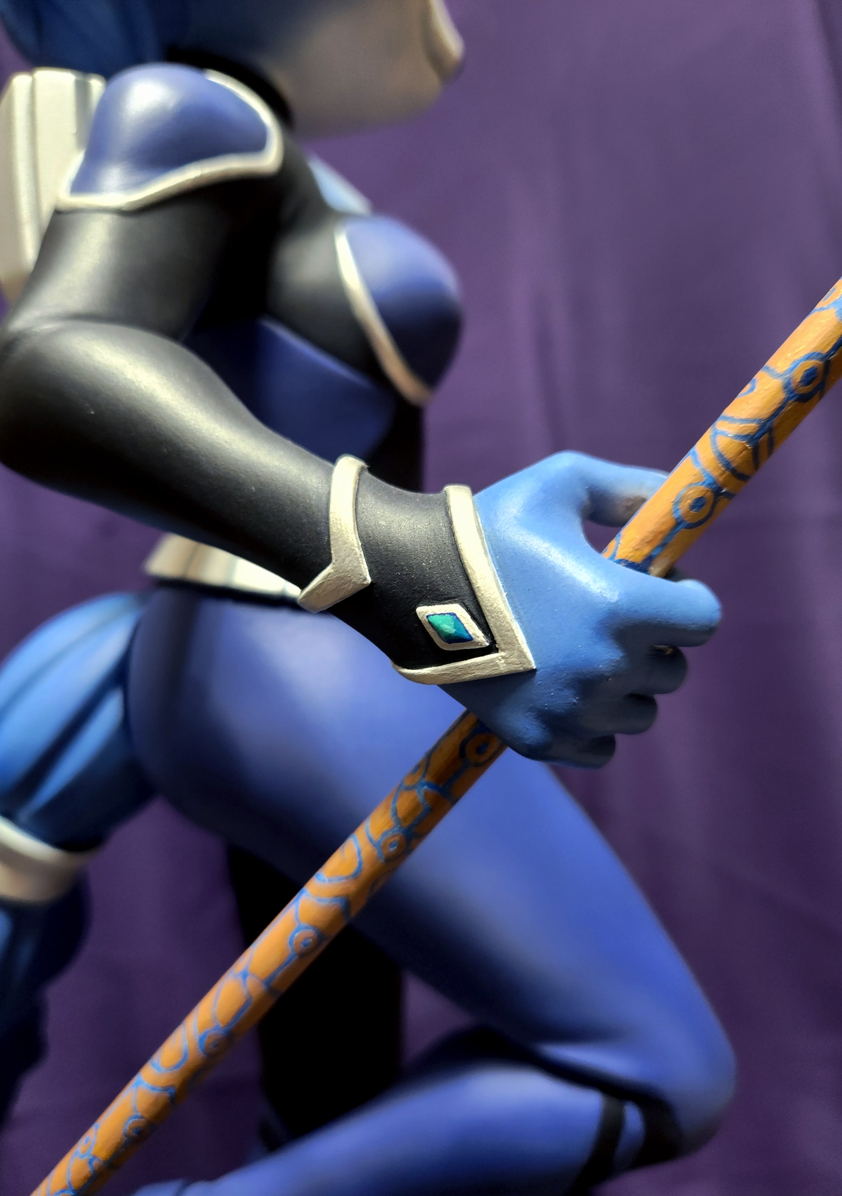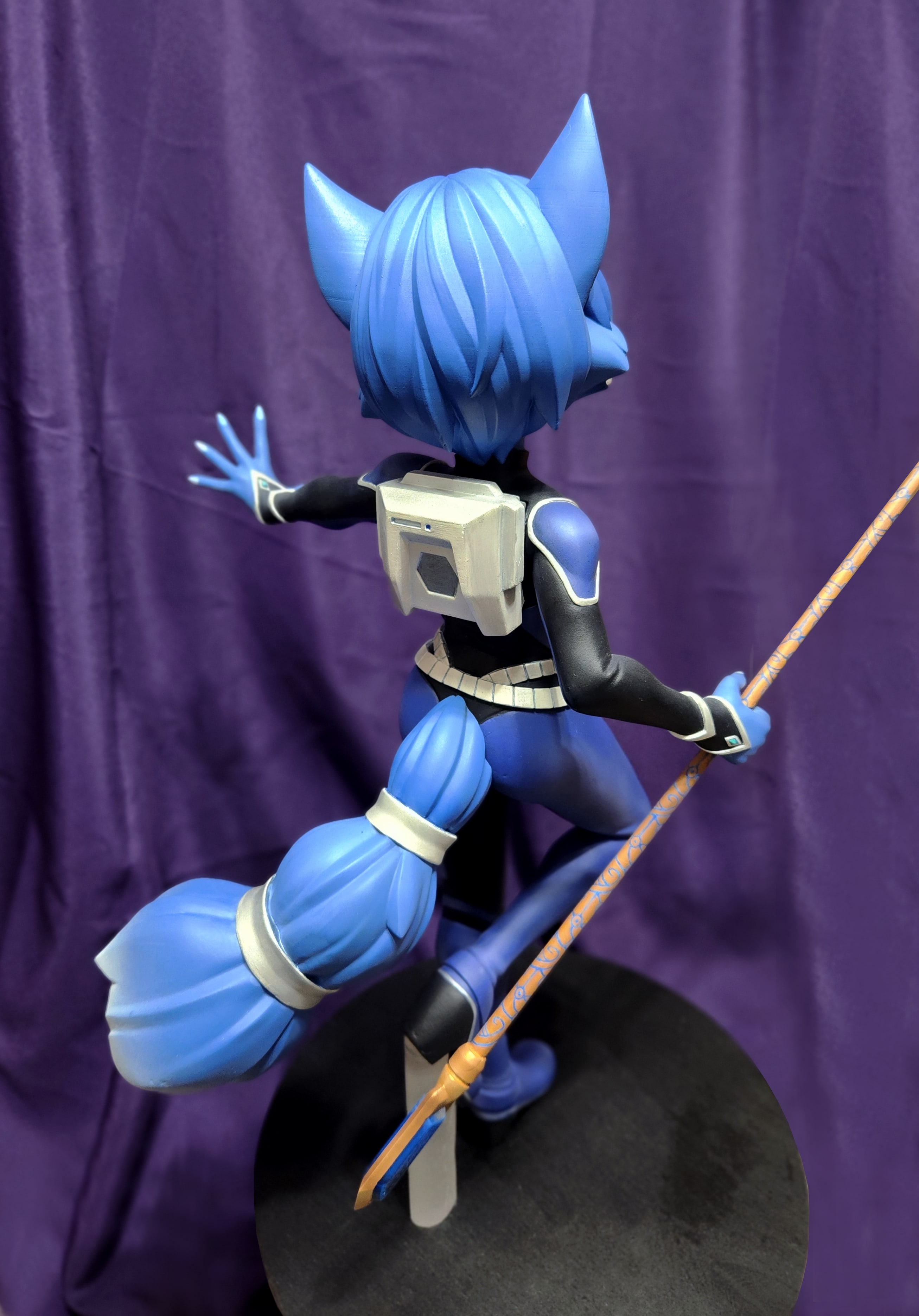 Since last time we posted about this project, they did all the sanding, priming, and painting to complete it. They had issues with the 3D printed staff being too weak, so it was replaced with a wooden dowel, which was then hand-painted with all the intricate details. As for the base she stands on, they were going to 3D print it, but the printer jammed during that part, so instead they used a hobby-store bought wooden stand, combined with a bunch of weights inside it to keep it stable.